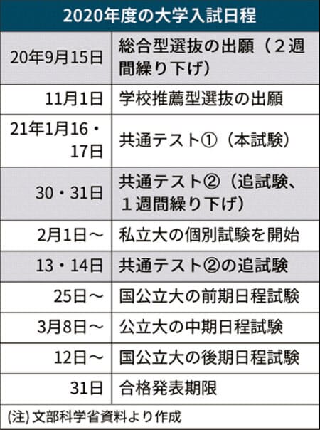 20年までの大学入試センター試験に代わる共通テストの本試験の日程は予定を変えず21年1月16、17日とする。従来1週間後に東京と大阪で行ってきた追試験は2週間後の同月30、31日に全47都道府県で実施する。新型コロナウイルス対策の休校による学習の遅れを理由に追試を受験することも可能とする。