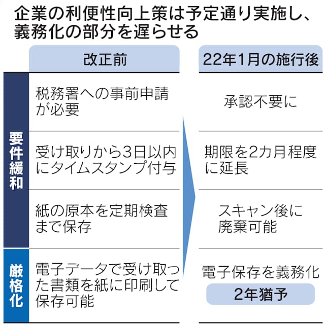 企業にとって便利になる部分は予定通り1月1日から施行する。例えば紙で領収書を受け取った場合にスキャナーで読み取って電子保存するのは簡単になる。これまで税務署長の事前の承認が必要だったのが不要になる。3日以内にタイムスタンプを付与しなければいけなかったのも2カ月程度に延ばす。