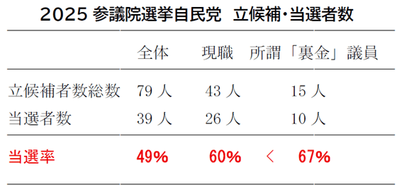 実際、下記報道では、裏金議員達15人のうち、5人も落選しており、裏金問題が今回の選挙結果に重く響いている、という印象を喧伝しています(時事通信、7月21日「『裏金候補』落選5人=当選10人、不信根強く【25参院選】」)。