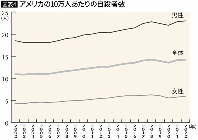 <アメリカでは自殺率が上昇し続けている。一体何が起きているのか。早稲田大学教授で政治学者の中林美恵子さんは「特に注視すべきは、白人男性の自殺率の高さだ。経済的に困窮する非大卒の白人男性が増えており、彼らは薬物やアルコール依存による死亡率も高い。経済格差がそのまま寿命の格差になっている」という――。