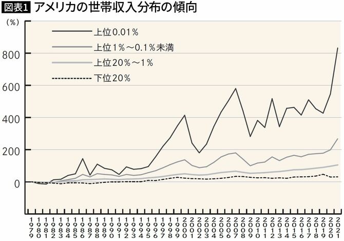 重要なことがもう一つあります。それは、富の配分が著しく偏っているということです。アメリカの格差は1990年頃から急拡大しています(図表1)。2021年にはトップ0.01%の収入が1979年比の約9倍、トップ1%の収入が約6倍になっているのに対して、下位20%の収入はほとんど変わっていないことがわかります。
