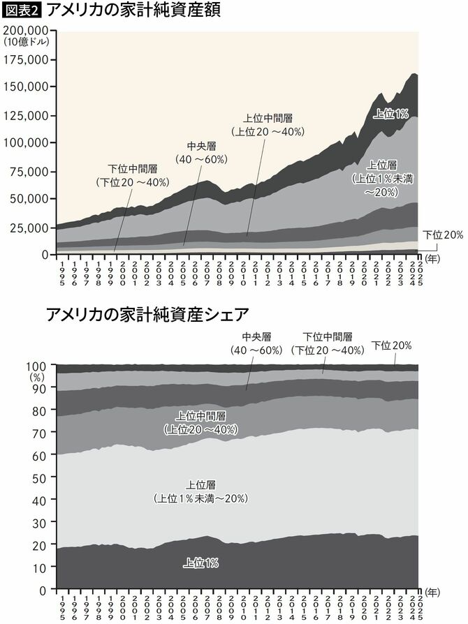 その結果として、アメリカの資産は大きな偏りを示しています。2024年第2四半期の純資産の保有を所得階層別にみると、トップ1%の収入が全資産の23%を占めています。上位20%の所得階層を見ると、1990年末には60%、2000年末に65%、2010年末に68%と上昇し、2024年には全資産の約70%を占めるに至っています(図表2)。