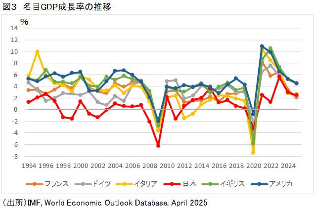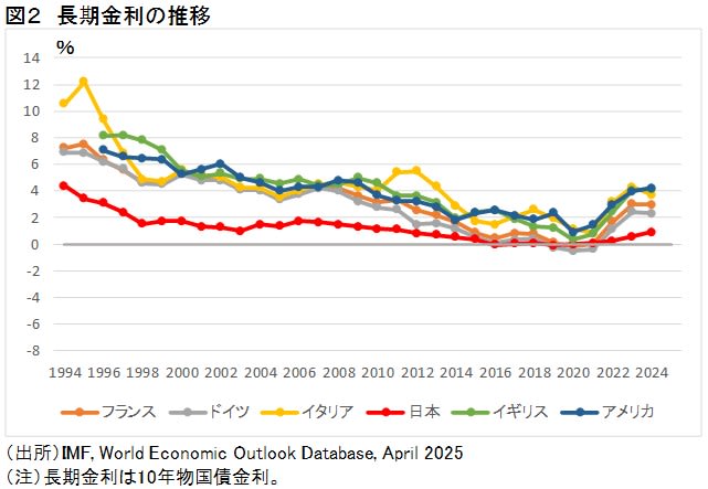 それぞれ、主要7か国について長期金利と名目GDPの上昇率を示したものだが、両者はパラレルに動いている。ただし、ある期間の成長率の低下がその期間の金利に影響を与えているわけで、年ごとに1対1では対応はしていない。