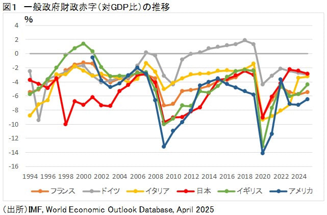 前編で示した図1をふたたび示そう。現在、日本の財政赤字(赤い線)は主要7か国のうちドイツを抜いて一番少ないことを示した、あの図である。